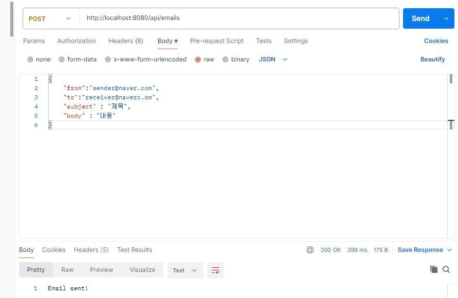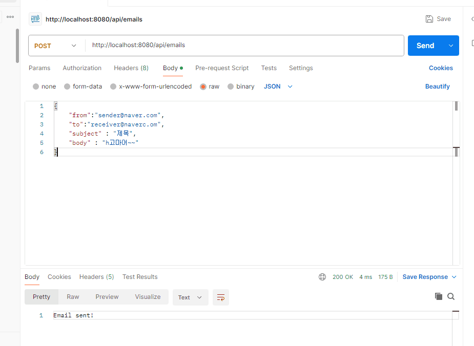 요청의 body 는 우리가 만들었던 SendEmailRequestDto 에 맞춰 작성하고 전송한다. 위 그림을 보면 성공적으로 응답이 반환되었다.
