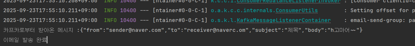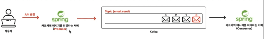 이전에 API 요청을 통해 Producer 서버를 거쳐 Kafka 의 email.send 토픽에 메시지를 쌓아뒀다. 그러고 Consumer 서버가 email.send 토픽에 쌓여있는 메시지를 하나씩 읽어들이면서 처리했다.