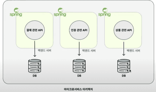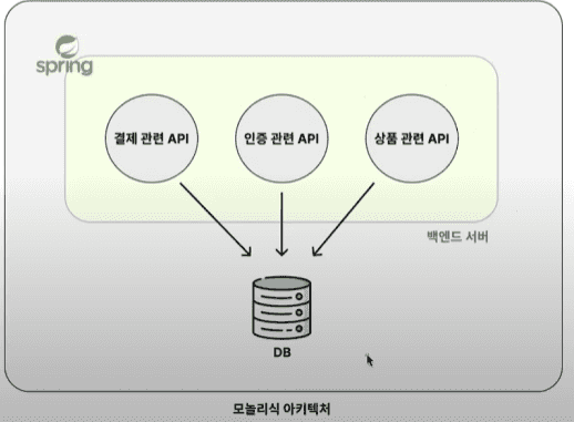 일반적으로 백엔드 서버를 구성할 때 활용하는 구조가 모놀리식 아키텍처다. 프로젝트 하나에 모든 API(결제 API, 인증 API, 상품 API) 를 전부 구현하는 방식이다.