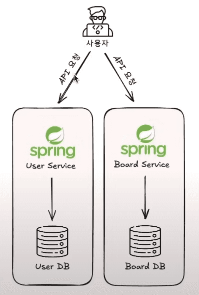 모놀리식 아키텍처에서는 사용자와 게시글 테이블을 만든다고 하면 보통 게시글 테이블에 user_id 라는 FK 를 두었을 것이다. 하지만 마이크로서비스 아키텍처는 다르다. 서버와 DB 가 전부 분리되어 있기 때문에 user_id 를 참조할 수 없다. 하지만 특정 게시글이 어떤 사용자의 게시글인지 파악하기 위해 user_id 에 대한 정보는 있어야 한다. 따라서 게시글 테이블에서 user_id 는 FK 를 설정하지 않은 채로 생성한다.