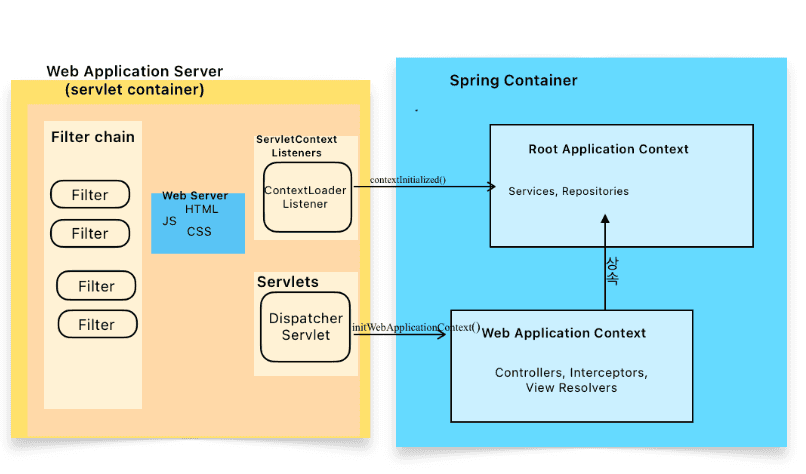 - 서블릿 컨테이너는 어플리케이션에 선언된 어노테이션이나 web.xml을 통해 Filter, Listener등을 찾고 초기화한다.